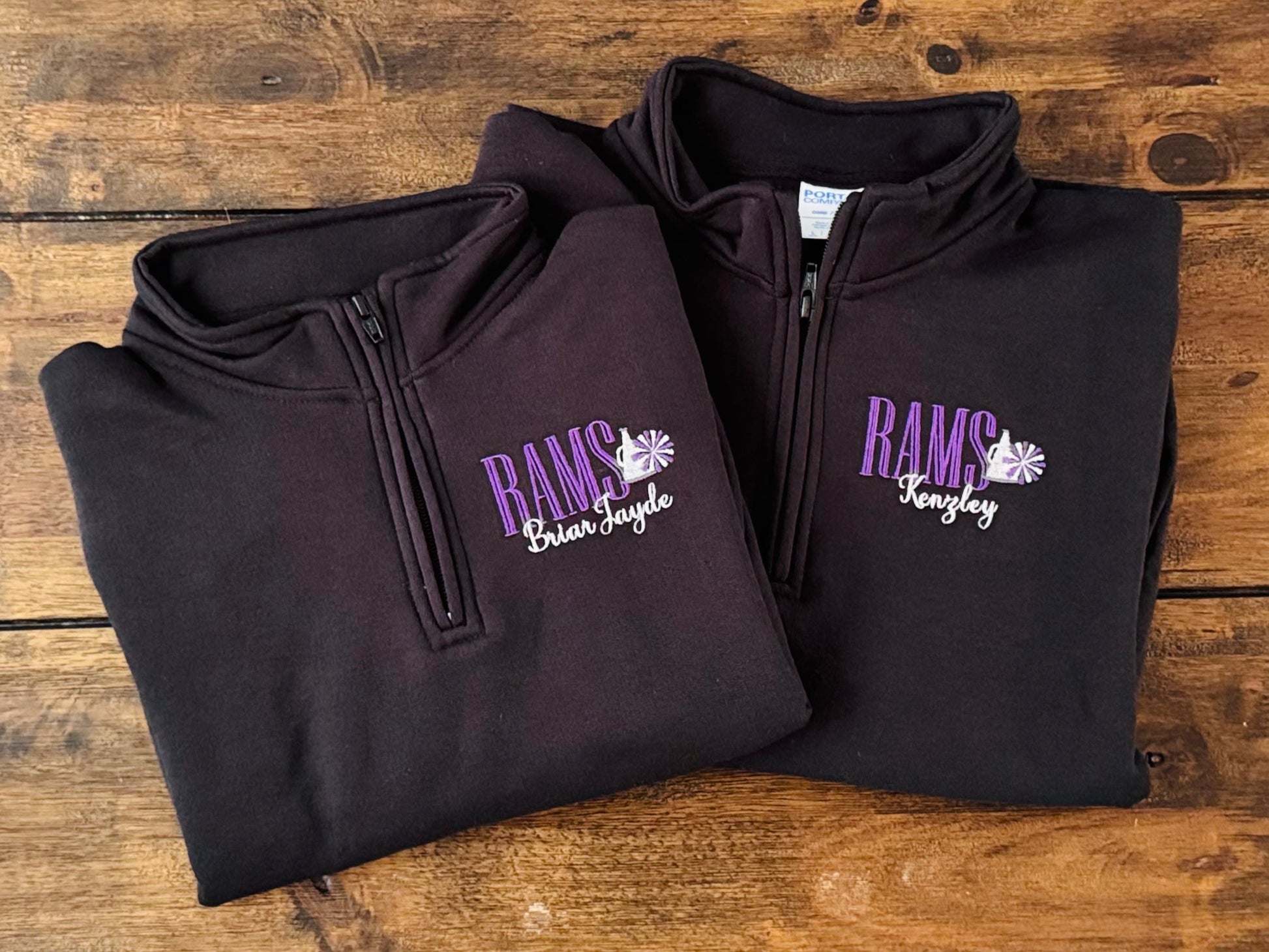 Stay warm while showing your team spirit in this cozy quarter zip, custom embroidered with RAMS cheer lettering, a megaphone, pom, and your cheerleader's name! Perfect for chilly games and practices.