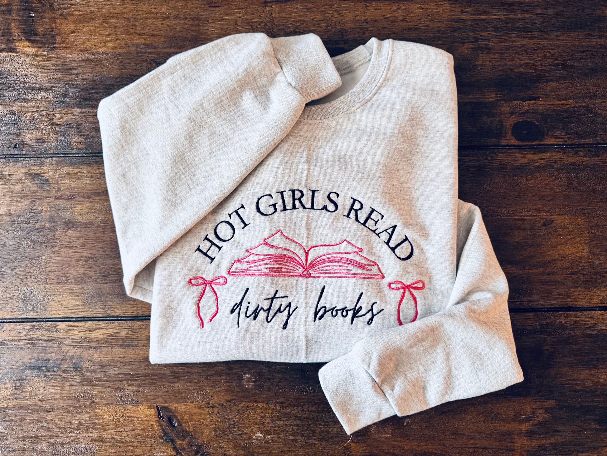 Embroidered crewneck with Hot Girls Read Dirty Books design. Available in ash gray or white crewneck with black and pink thread.