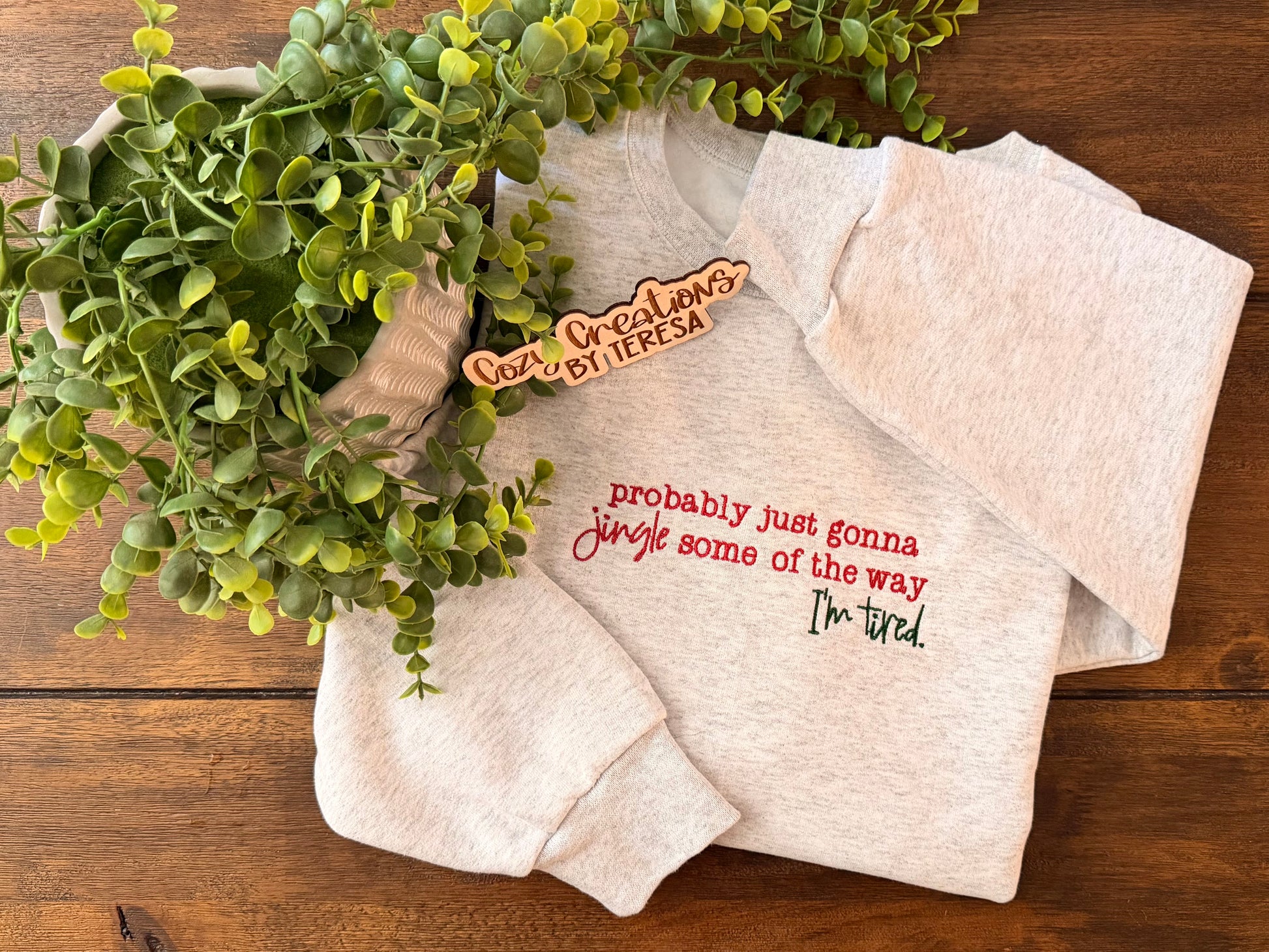 Bring some honest holiday humor to your wardrobe with our “probably just going to jingle some of the way — I’m tired” crewneck. This ash gray sweatshirt is comfy, cozy, and embroidered in festive green and red thread for the perfect touch of Christmas spirit… with a dose of real-life exhaustion we can all relate to.